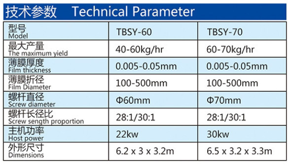 機器特性 吹制各種規格的低密度聚乙烯、高密度聚乙烯和線性低密度聚乙烯塑料薄膜,廣泛應用于食品百貨、日用、化工、針紡品、購物禮袋和工業包裝。機筒、螺桿采用38CrMoAl合金材料經氮化處理精密加工而成
